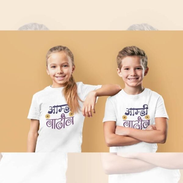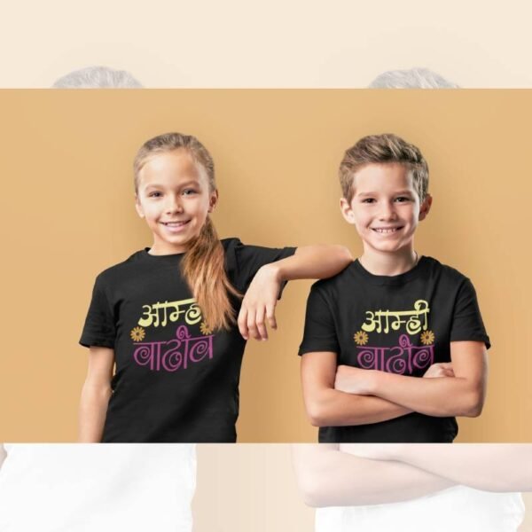 Celebrate the power-packed bond of siblings this festive season with our Amhi Vadhiv Siblings Marathi Printed T-shirt for Kids – the perfect Raksha Bandhan special T-shirt for kids! Featuring the bold and fun Amhi Vadhiv Marathi slogan, this stylish kids half sleeve T-shirt adds a cool twist to sibling love.
