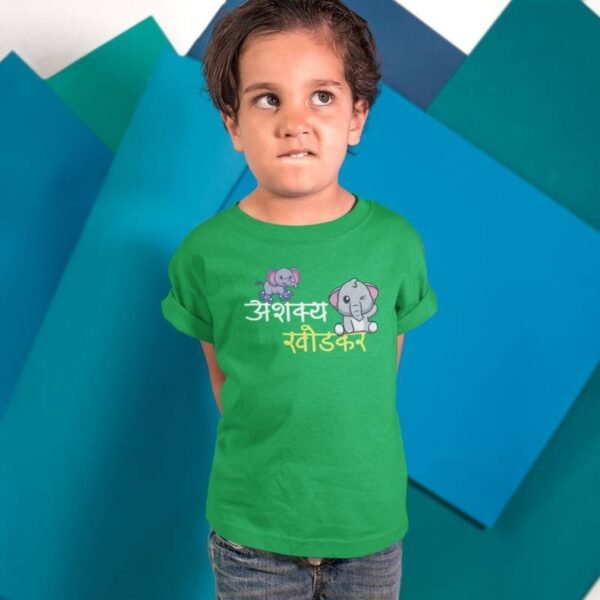 Celebrate your little one’s mischievous spirit with our bold and funny “Ashakya Khodkar” Marathi printed T-shirt for kids. Whether they’re climbing furniture or asking 100 questions a minute, this T-shirt is the perfect way to say it loud – “Yes, I’m proudly impossible and naughty!”