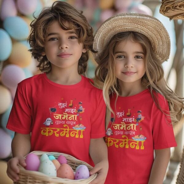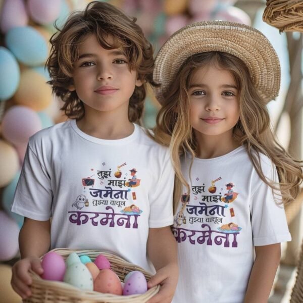 Celebrate the sweet-and-sour bond between siblings with our “Tujha Maza Jamena, Tujhya Vachun Karmena” Marathi printed T-shirt for kids. This witty and heartwarming line perfectly captures every brother-sister relationship — full of nok-jhok, yet inseparable!