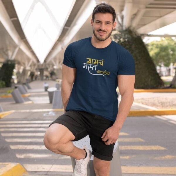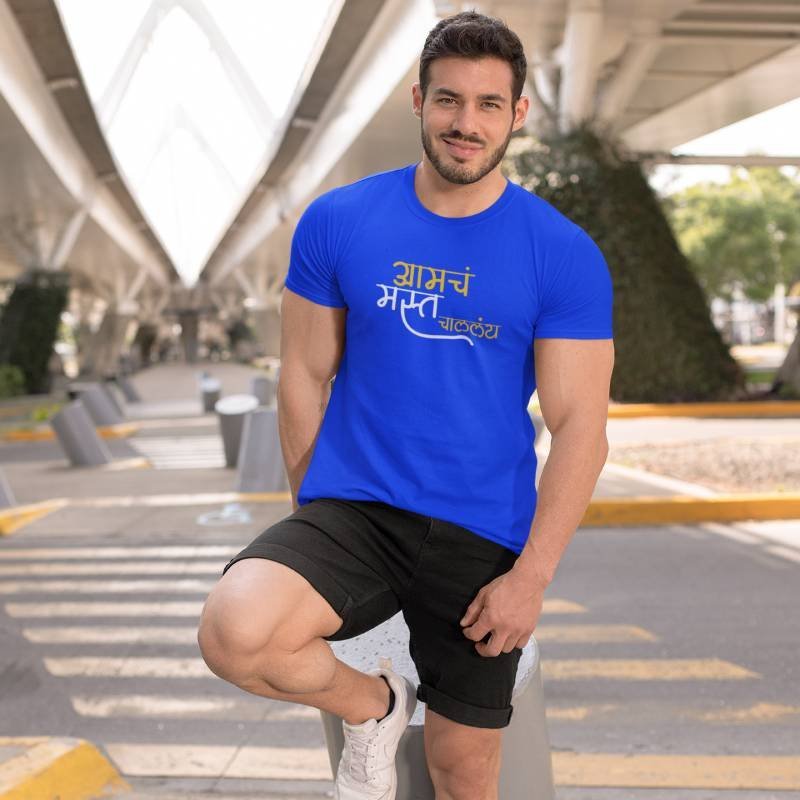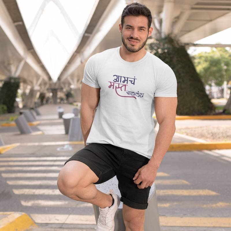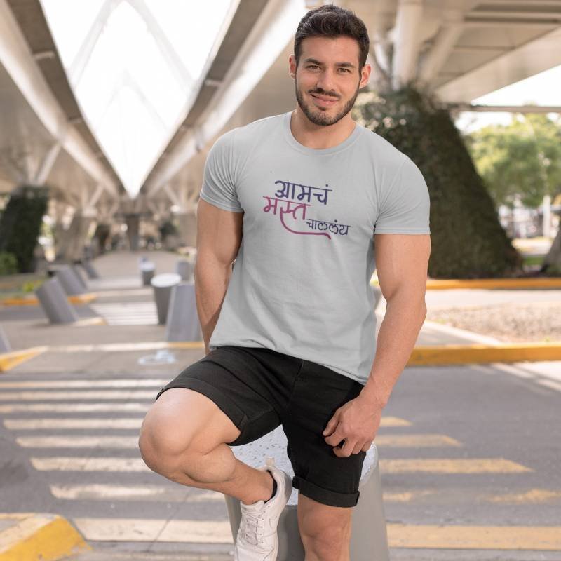 Aamcha Mast Challay T-shirt | Marathi quote printed T-shirt for Men and Women | Marathi funny quotes T-shirt | Unisex Marathi quote shirt | Marathi cotton T-shirt online | Unisex Marathi quote T-shirt