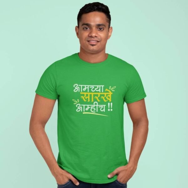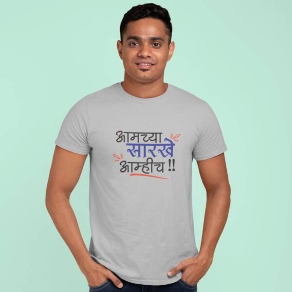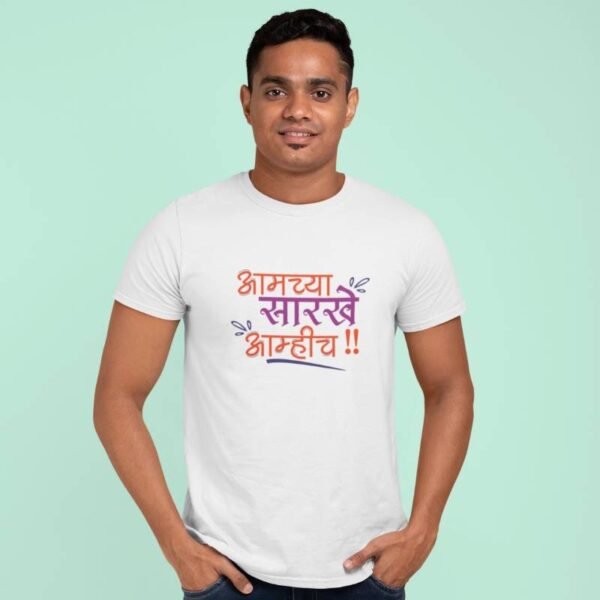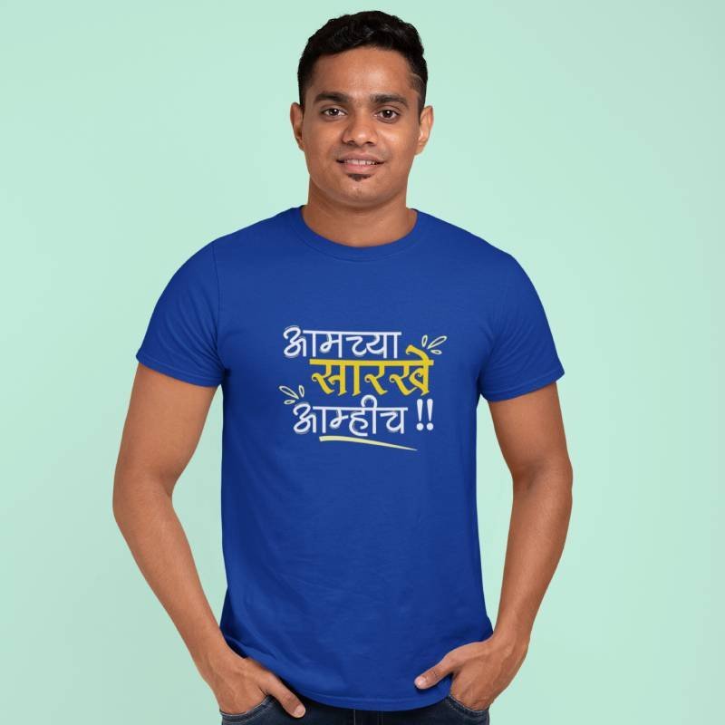 Make a bold cultural statement with the “Aamchya Sarkhe Aamhich” Marathi Quotes Printed T-shirt – the perfect blend of pride, style, and comfort. Designed for both men and women, this adult unisex half sleeve graphic t-shirt features a striking Marathi quote that celebrates Maharashtrian swag and individuality.