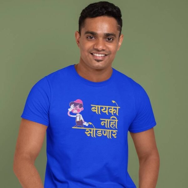 The “Bayko Nahi Sodnar Marathi Quotes Printed T-shirt for Men and Women” is a stylish and humorous tee that features a bold and playful Marathi phrase, “Bayko Nahi Sodnar,” making it a perfect way to express your wit and pride in Marathi culture. Made with high-quality, soft fabric, this Cotton T-shirt is both comfortable and trendy, ideal for casual outings, parties, or just hanging out with friends. Whether you’re a Marathi speaker or simply love Marathi humour, this T-shirt adds a fun, cultural touch to your wardrobe. Show off your unique sense of humor and cultural pride with every wear of this fun and iconic Marathi quote tee!