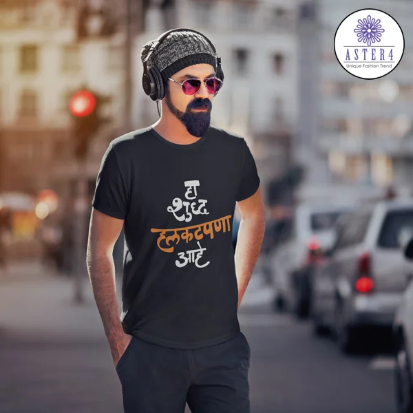 “Add some cheeky humour to your wardrobe with the “Ha Shuddha Halkatpana Ahe” T-shirt, which translates to “This is pure mischief” in Marathi. This bold and playful quote is perfect for anyone who embraces their mischievous side with pride. Whether you’re teasing friends, having fun, or just want to make a statement, this t-shirt lets everyone know that you don’t take life too seriously. Made from soft, high-quality fabric, it’s ideal for casual outings or laid-back moments. Show off your love for Marathi humour and your carefree attitude with this fun and stylish tee!”