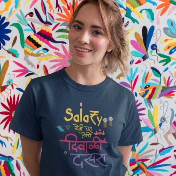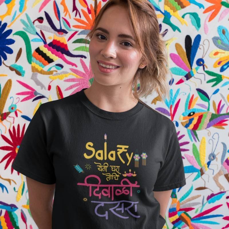 Celebrate the festive season with a touch of humour in the Salary Yeti Ghara Tochi Diwali Dasara Unisex Printed T-shirt. Featuring a playful and relatable quote that captures the joy, excitement, and sometimes the reality of festive spending, this shirt is perfect for your Diwali and Dasara celebrations. Whether you’re enjoying family time, shopping for sweets, or attending the festive gatherings, this shirt adds a fun twist to your holiday wardrobe. Made from soft, breathable fabric, it’s as comfortable as it is stylish—perfect for the long days of festivities. With its unisex fit, it’s a versatile and fun choice for anyone who loves the holiday season and a good laugh.