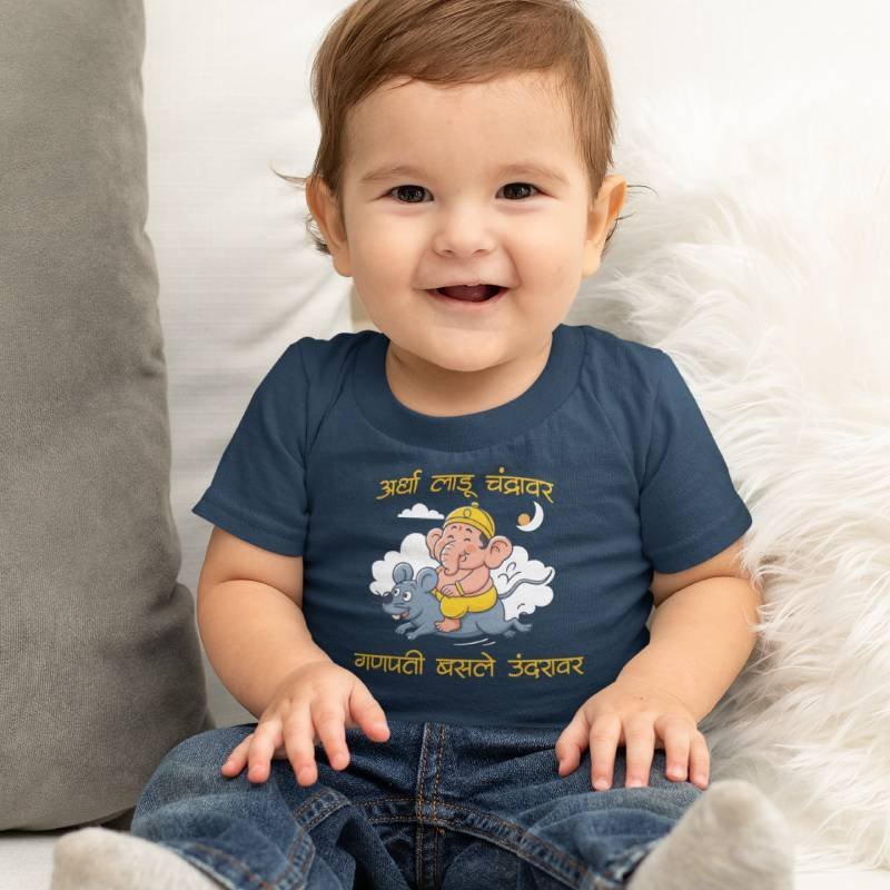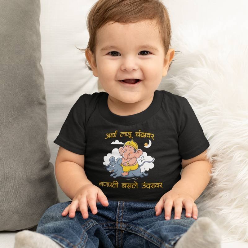 Be the first to review “Ardha Ladoo Chandrawar Ganpati Basale Undrawar Marathi Printed Tshirt for Kids”